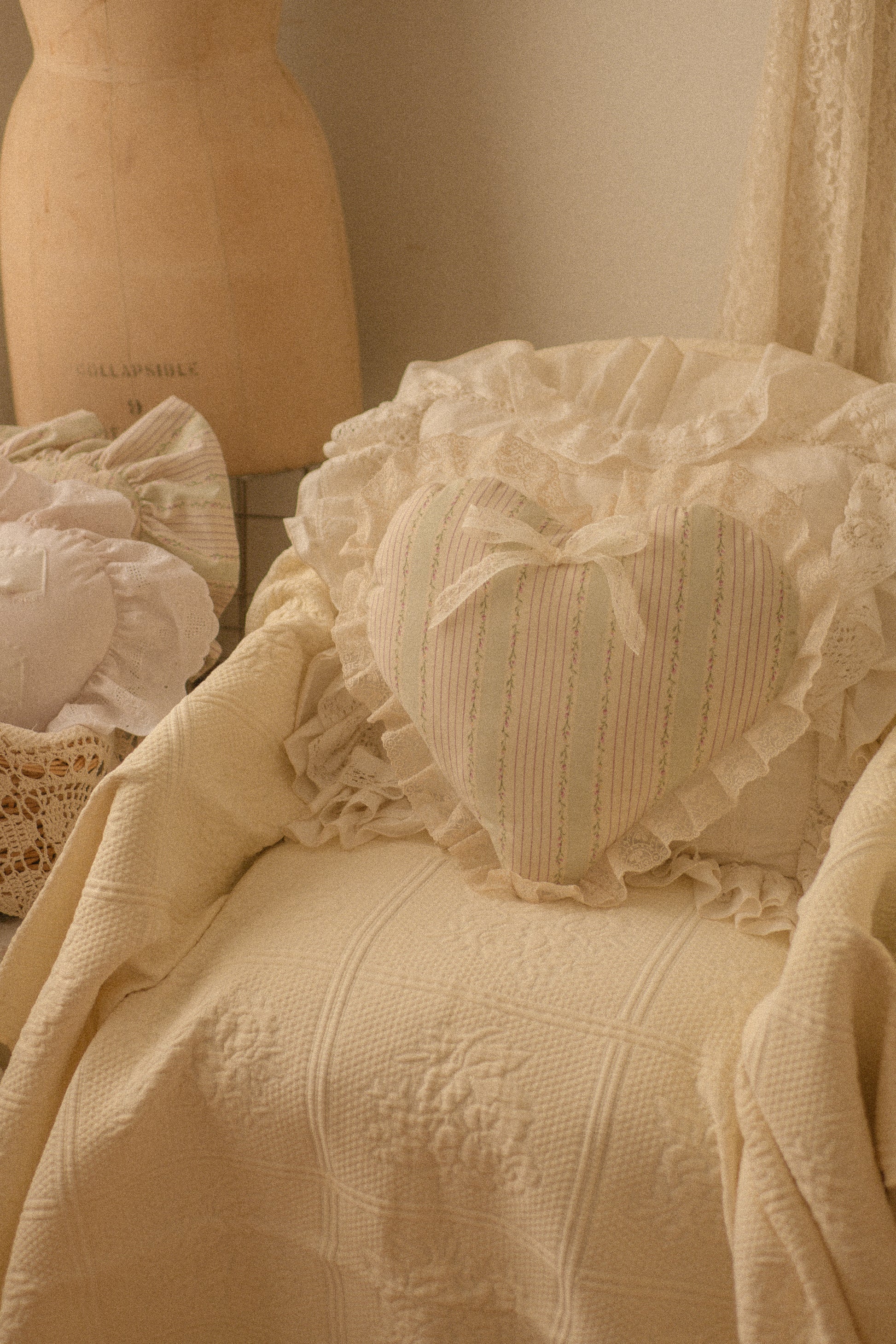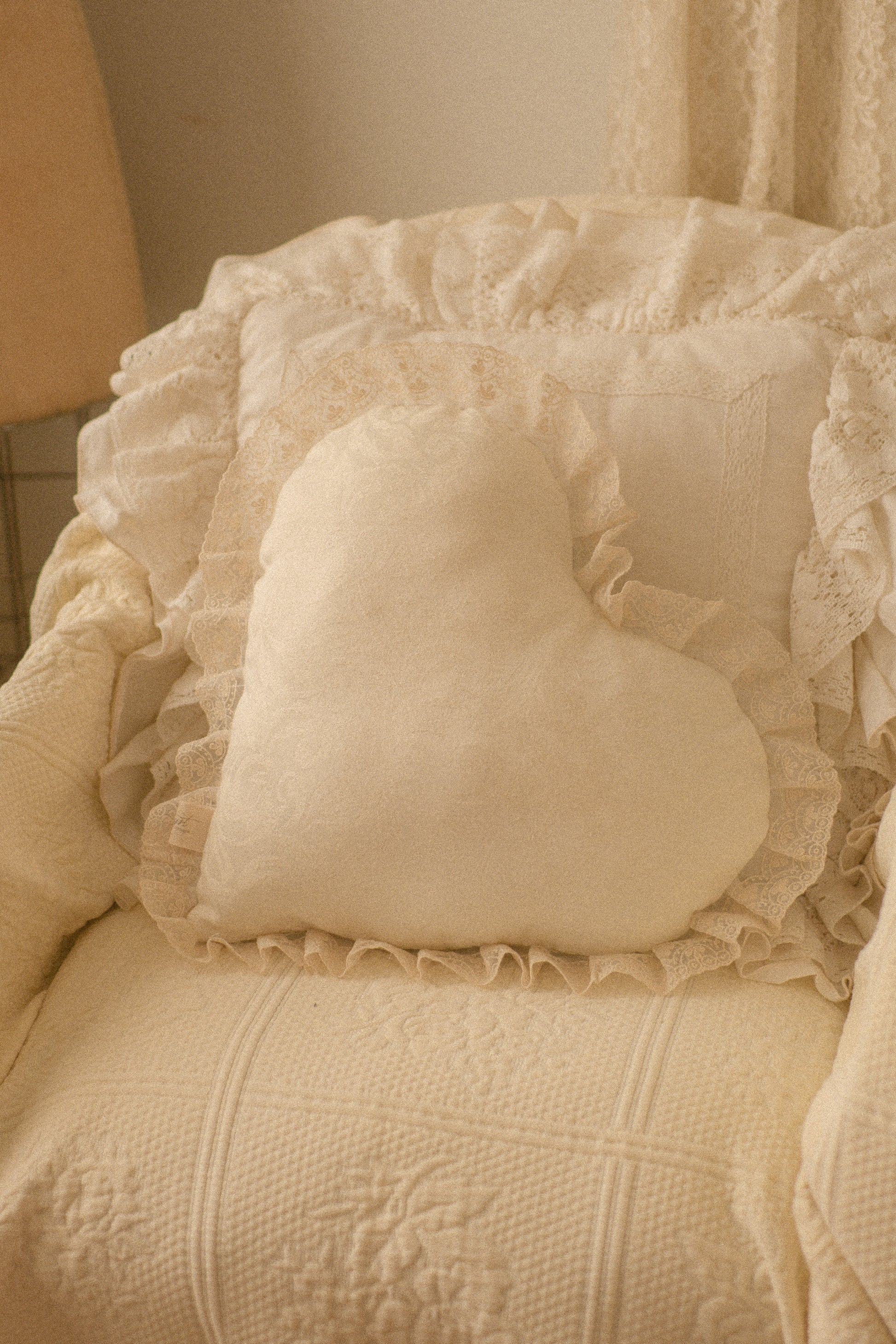 Delicate as a love letter and sweet as a summer's day, this heart-shaped pillow is a dreamy ode to romance & timeless beauty. Handmade with love , featuring a soft lace trim . Perfect for adorning your bed, cozy chair, or favorite daydreaming spot, this gentle treasure brings a tender touch of cottagecore grace to any space, a heart full of softness, stitched with sentiment.