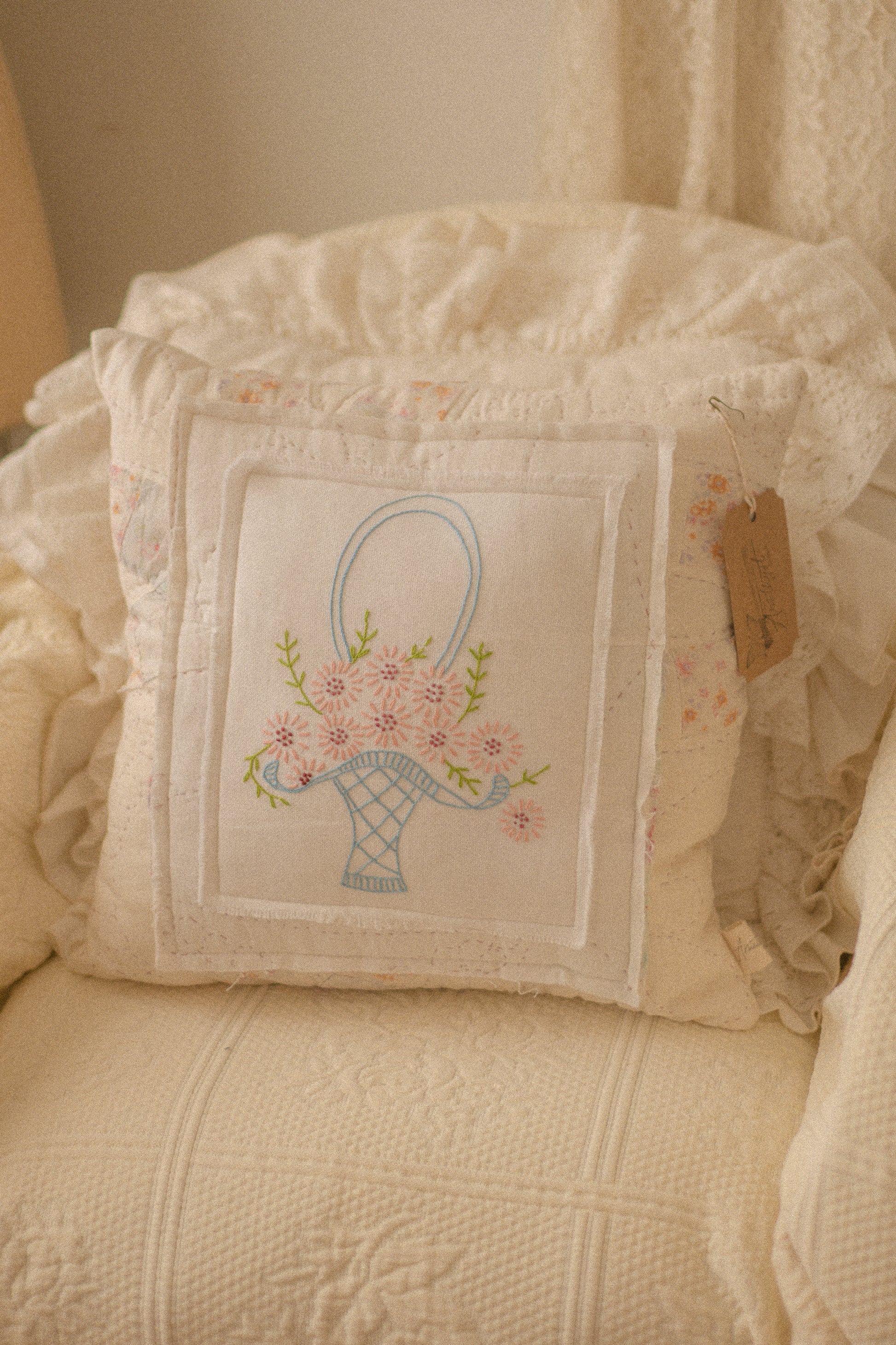 Handmade with love, this embroidered pillow features delicate hand-stitched details that add a charming, vintage touch to your cozy space. Made with a beautiful vintage quilt & a lovely floral embroidery.