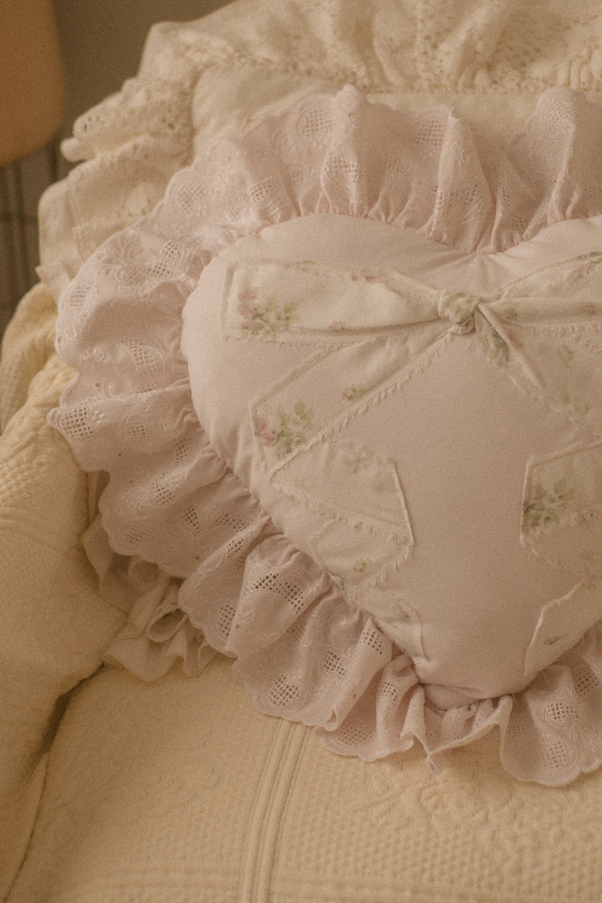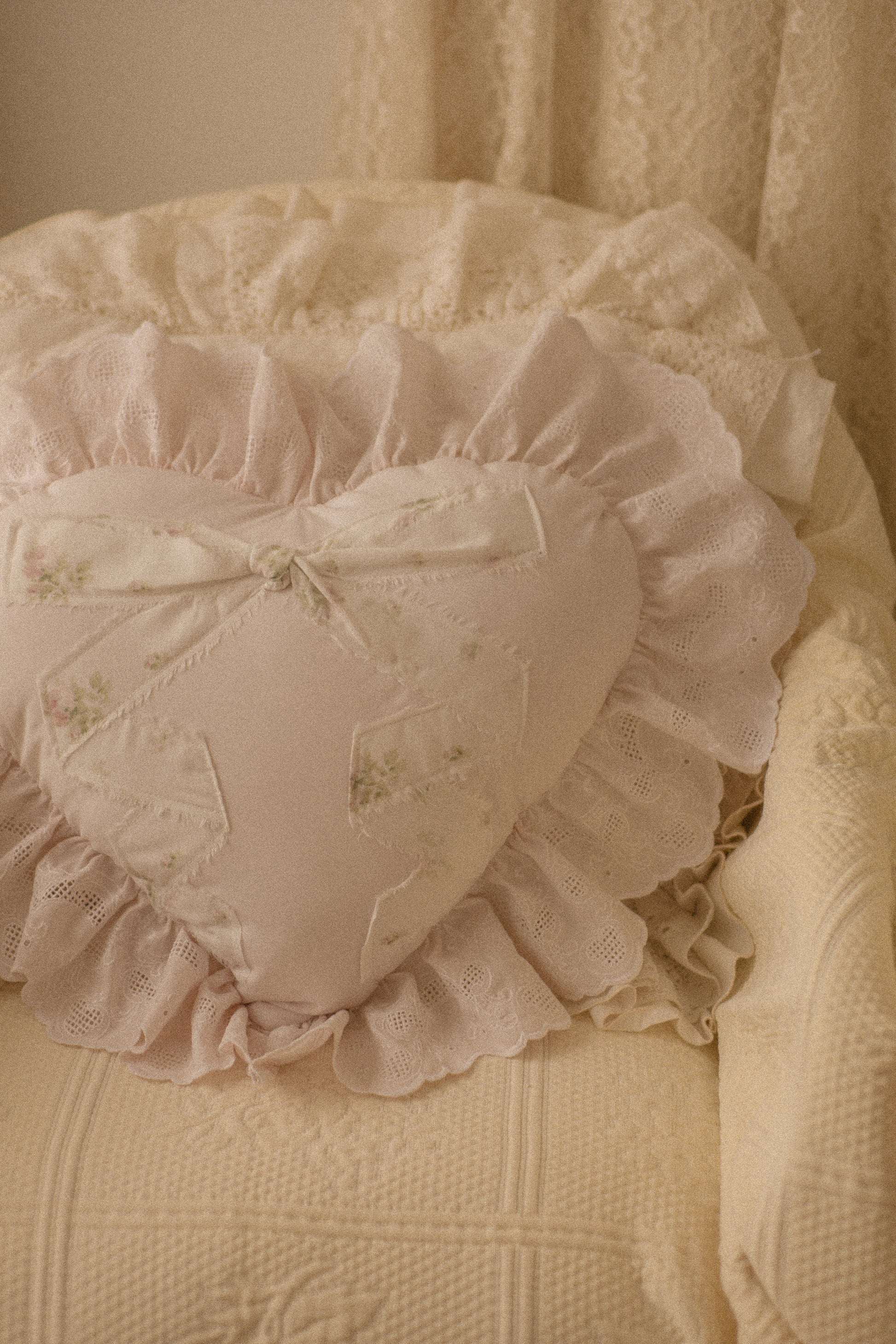 Delicate as a love letter and sweet as a summer's day, this heart-shaped pillow is a dreamy ode to romance & timeless beauty. Handmade with love , featuring a soft ruffled edges and charming eyelet lace in a lovely shade of pink Perfect for adorning your bed, cozy chair, or favorite daydreaming spot, this gentle treasure brings a tender touch of cottagecore grace to any space, a heart full of softness, stitched with sentiment.