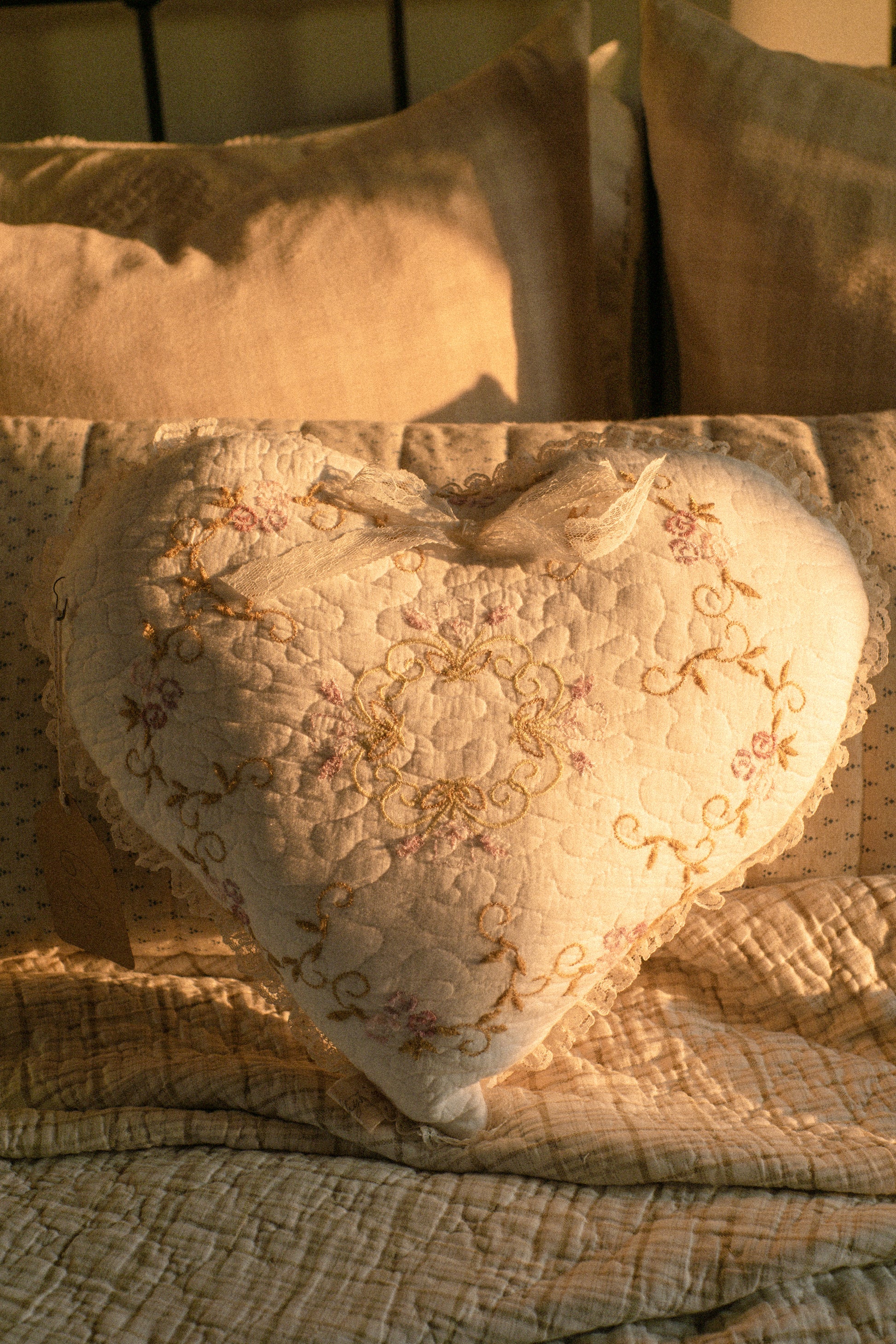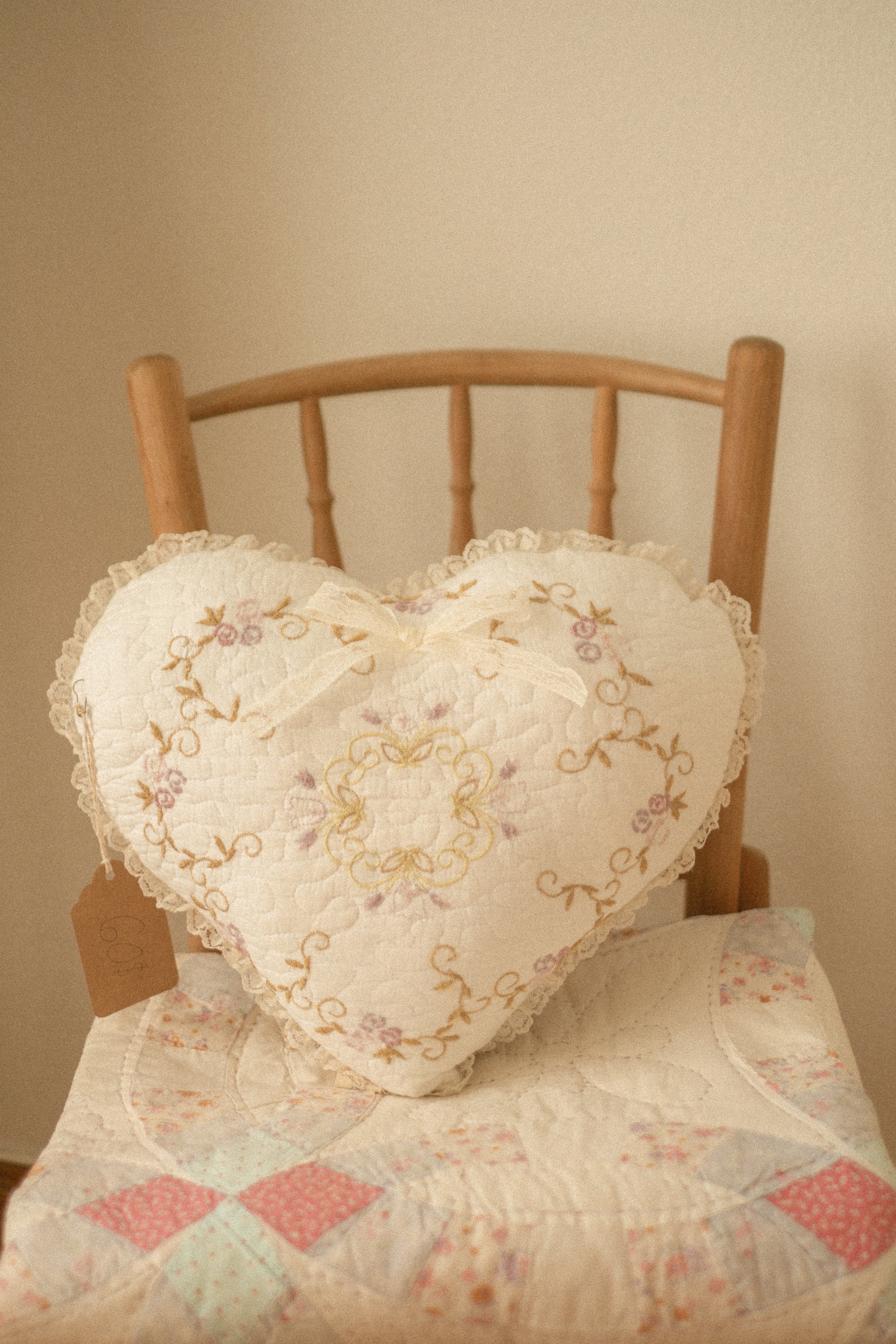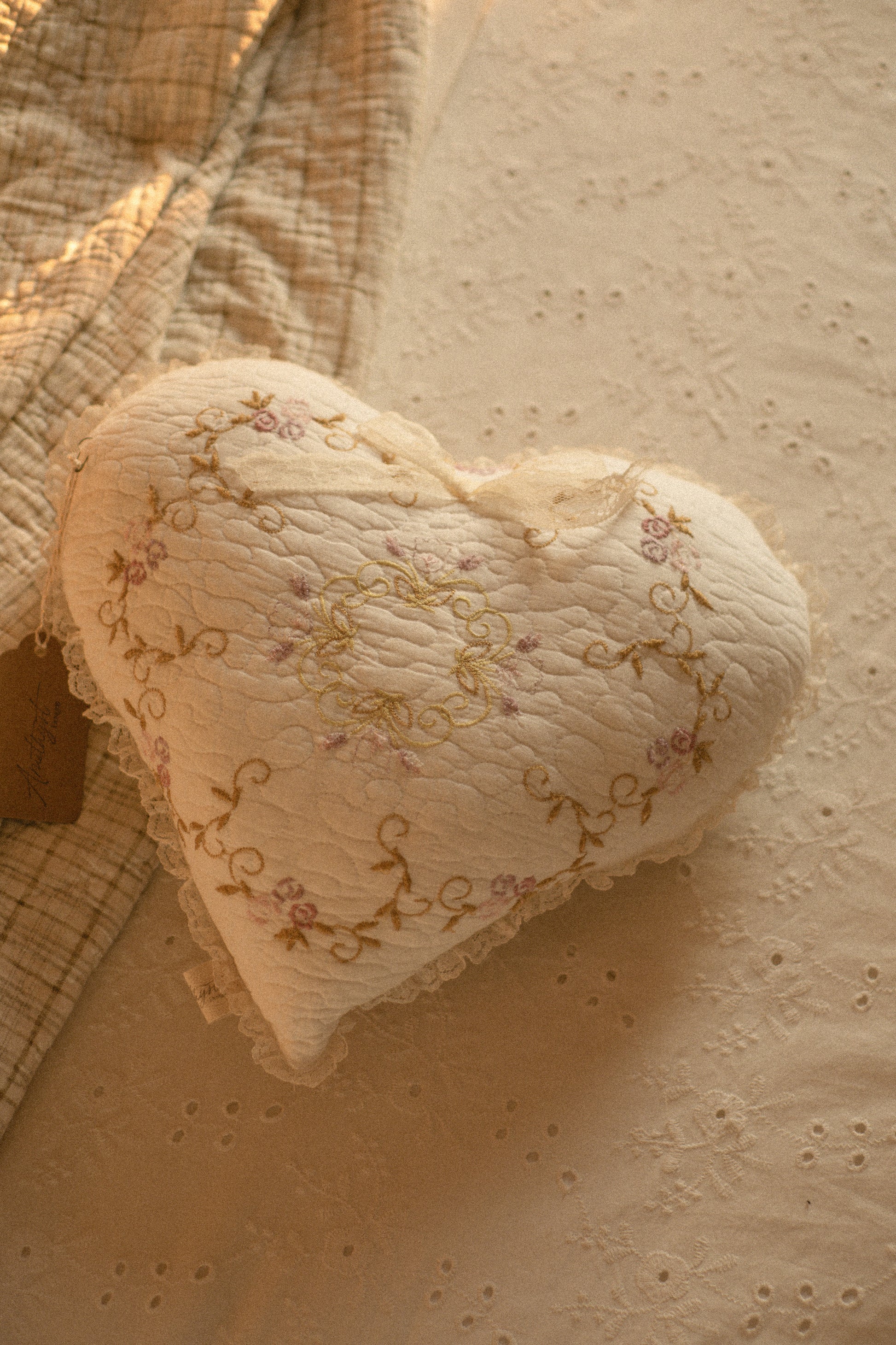 Delicate as a love letter and sweet as a summer's day, this heart-shaped pillow is a dreamy ode to romance & timeless beauty. Handmade with love , featuring a soft ruffled edges and charming eyelet lace in a lovely shade of cream. Perfect for adorning your bed, cozy chair, or favorite daydreaming spot, this gentle treasure brings a tender touch of cottagecore grace to any space—a heart full of softness, stitched with sentiment.