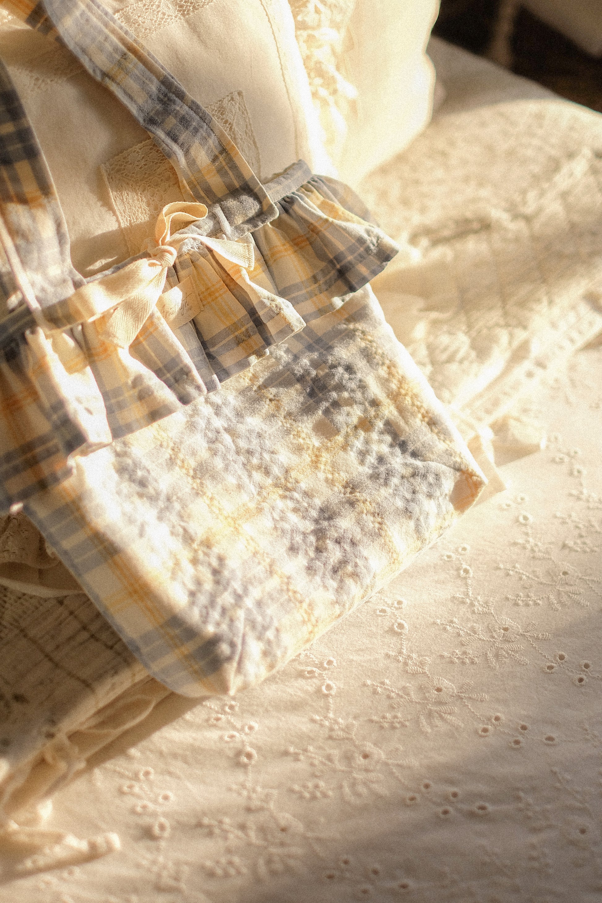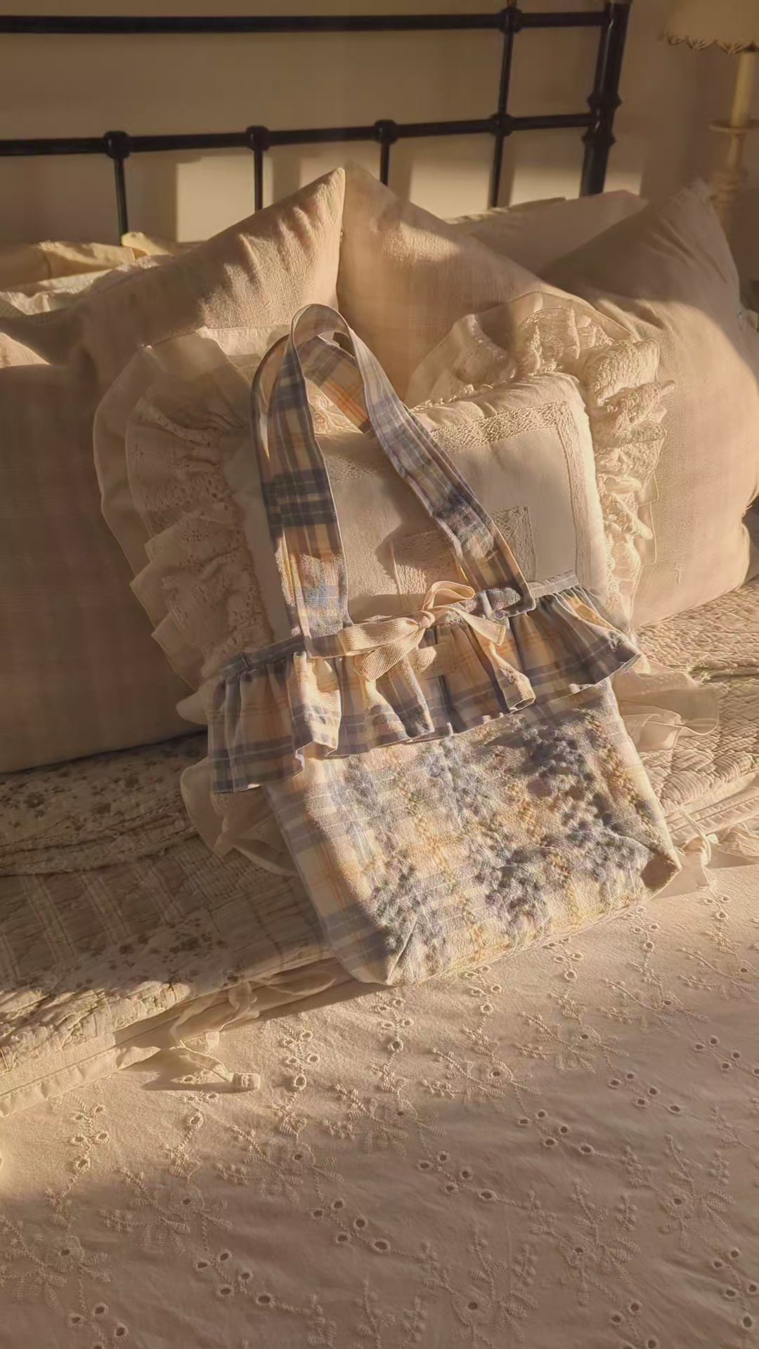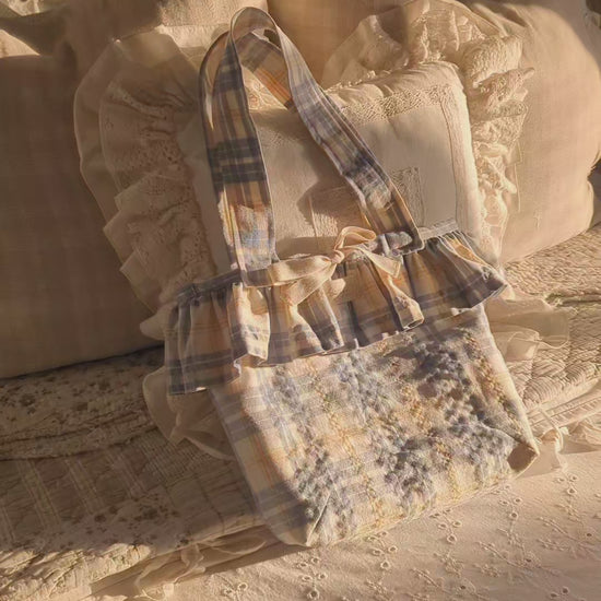 Like sunshine on a spring afternoon, this buttery-soft tote features a cheerful yellow and blue plaid print, delicate ruffled edges, and a sweet bow closure. Handmade with love, it’s the perfect carryall for farmers’ market strolls, picnics in the park, or just adding a playful touch to your day.✨