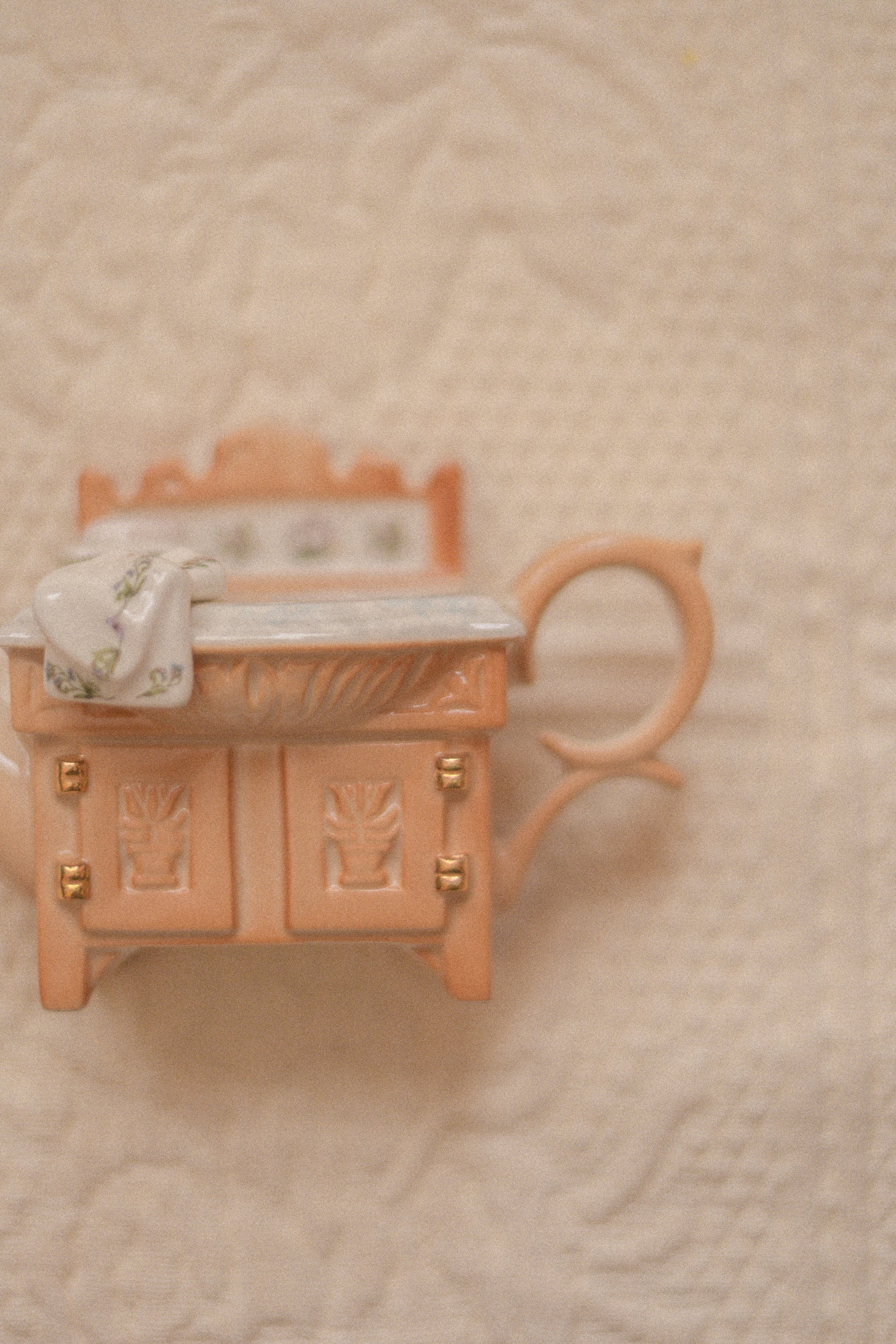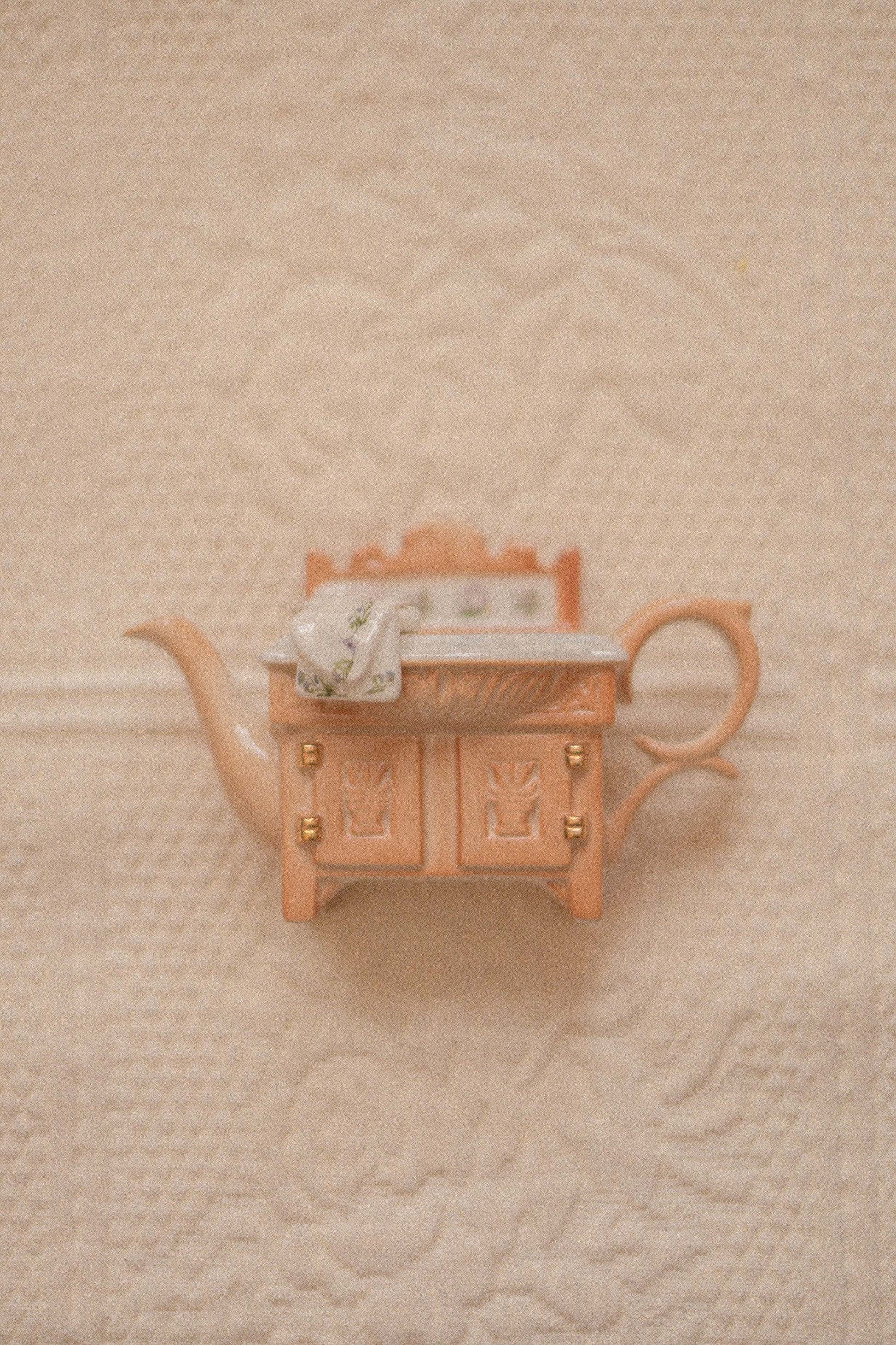 A delightful vintage teapot-shaped knick-knack, thoughtfully designed as a miniature kitchen hutch formed into the shape of a teapot. Full of whimsical detail and nostalgic charm, this unique piece feels like a true collector’s treasure, playful yet timeless. Perfect for display shelves, kitchen nooks, or curio cabinets, it adds a touch of storybook warmth and vintage character to any space.