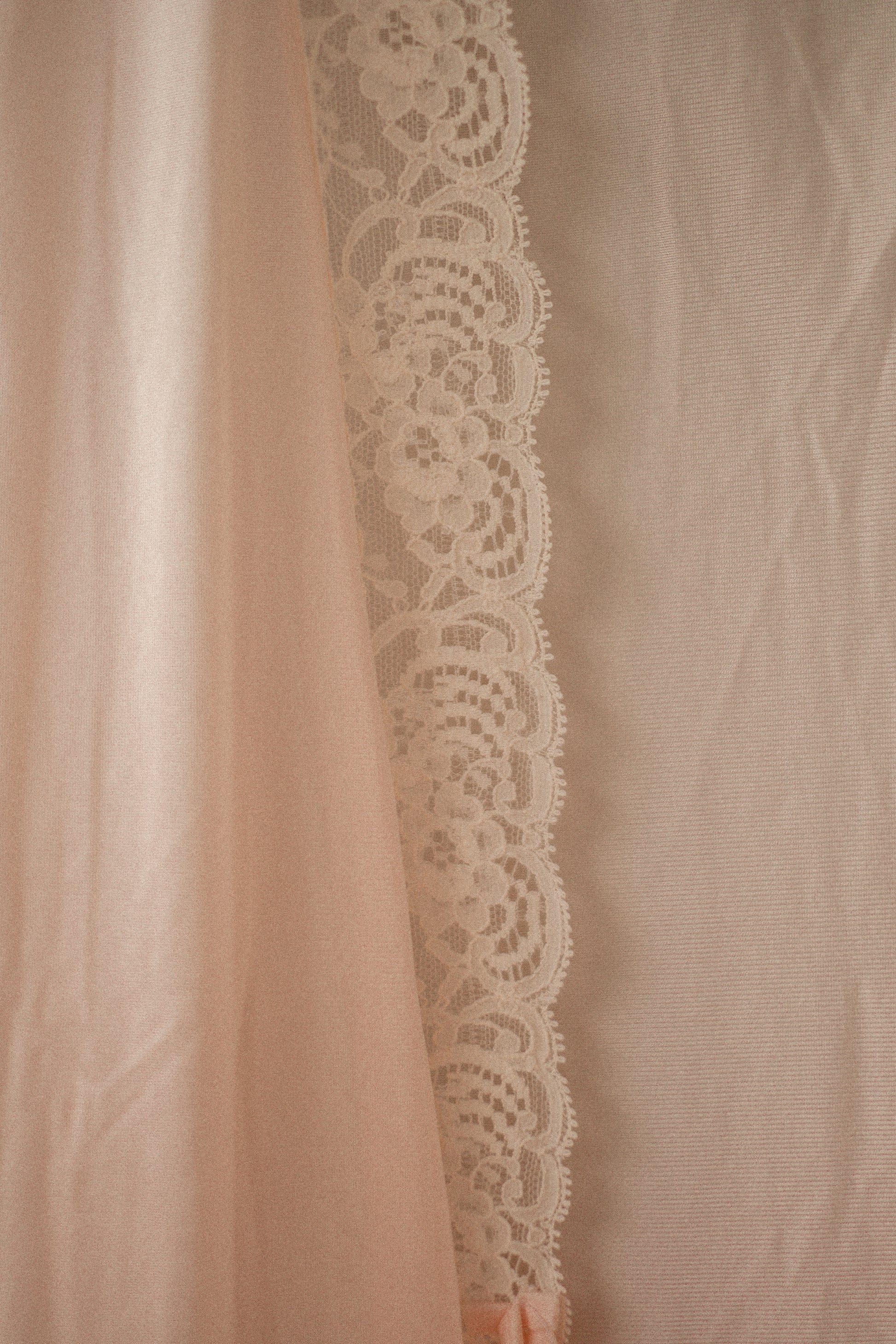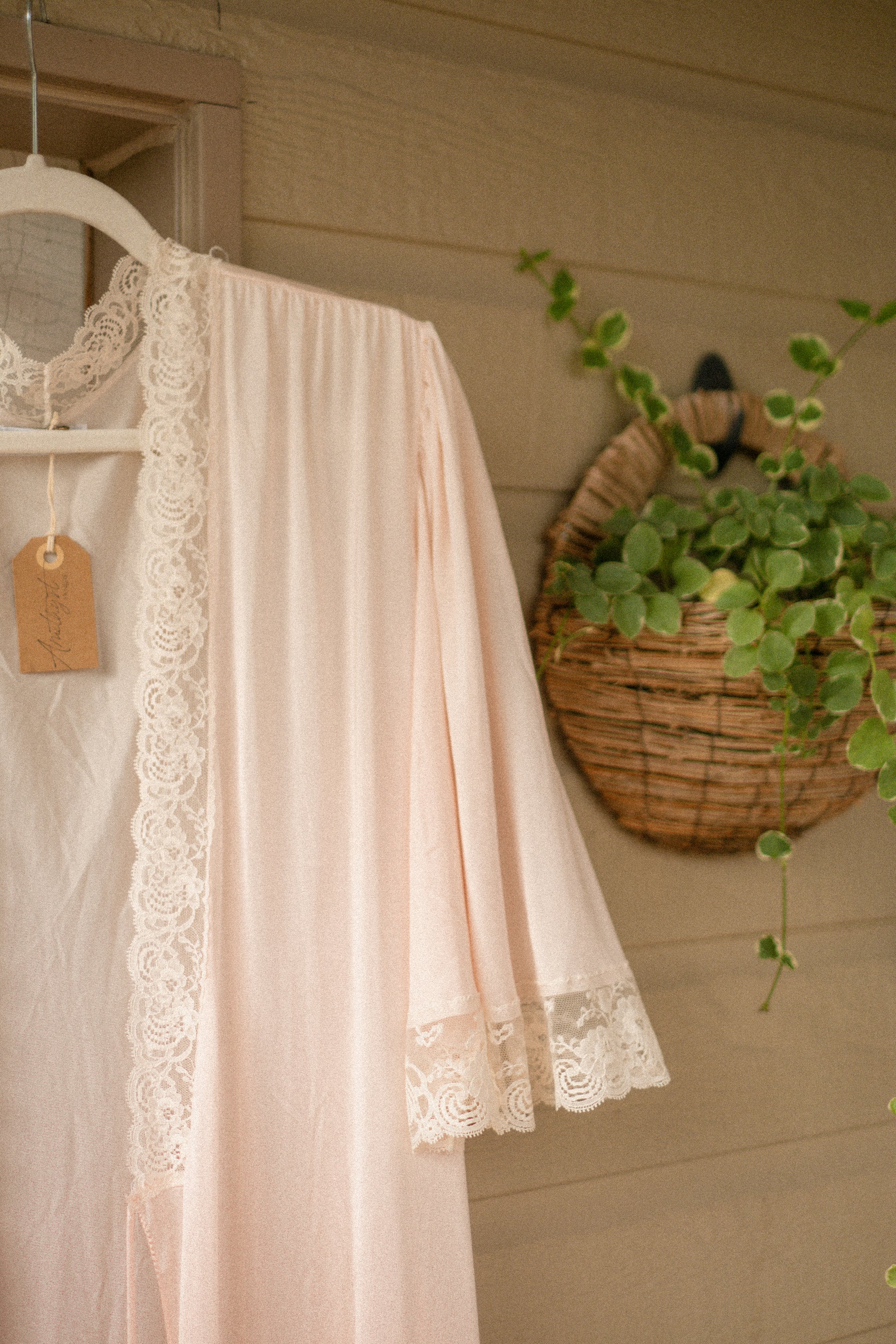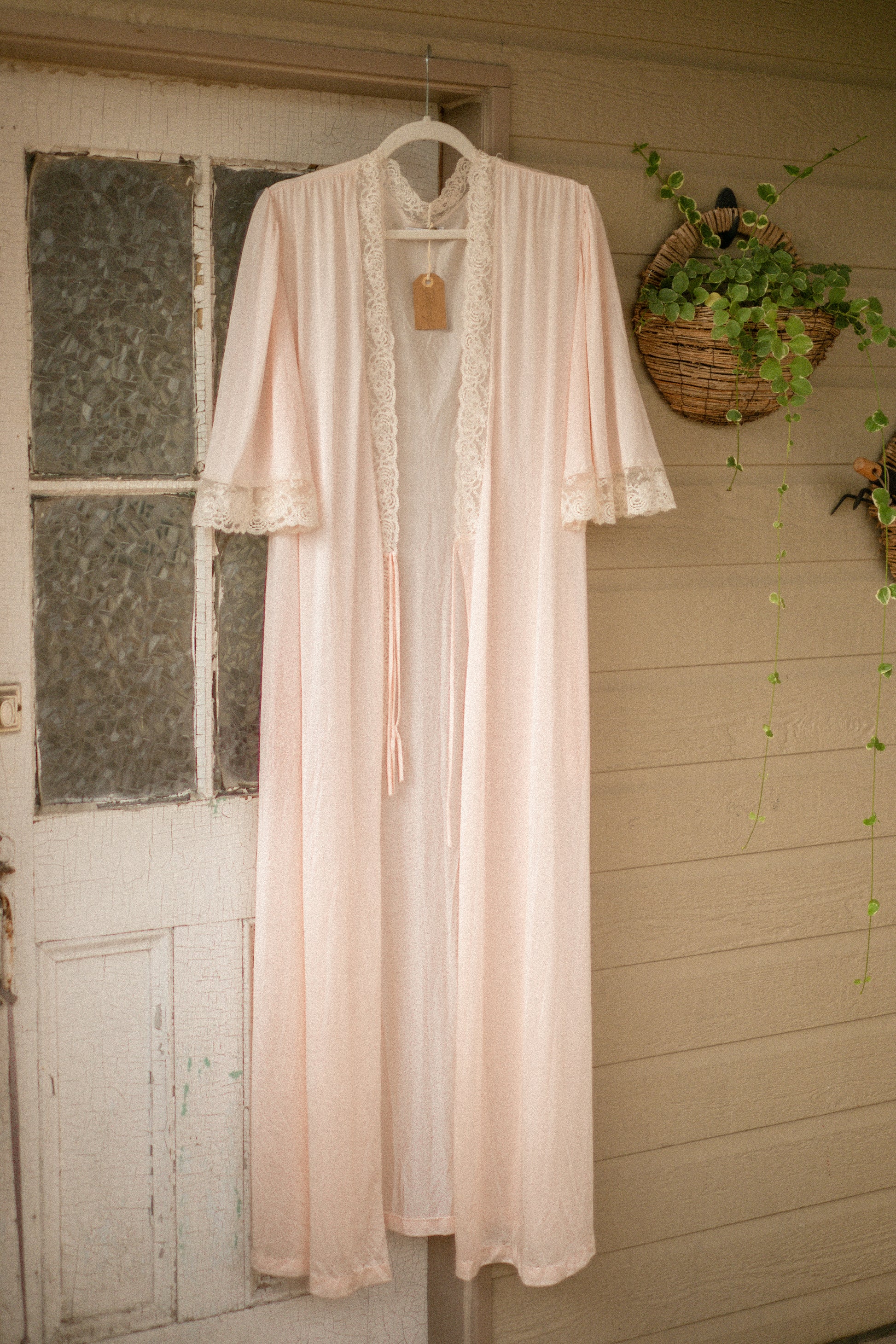Wrap yourself in playful elegance with our Vintage lace trimmed baby pink robe. The delicate lace adds a touch of romance to the lovely pink hue, making it perfect for lounging or getting ready. Don't miss out on this charming addition to your wardrobe!