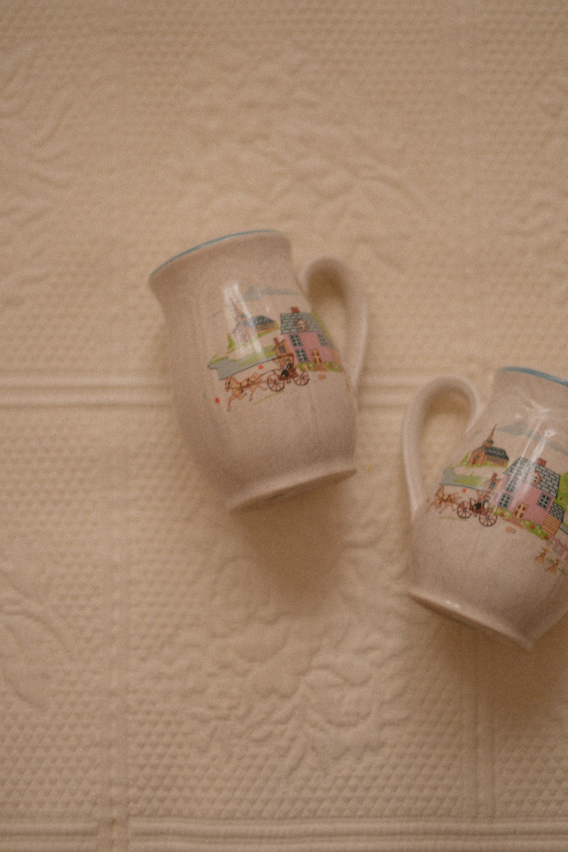 A delightful vintage salt and pepper shaker set, complete with a petite carrying handle and charming cottage artwork on the front. Thoughtfully designed and full of character, this sweet set brings a storybook warmth to the table, evoking cozy kitchens and gentle everyday rituals. Both practical and decorative, it feels like a small but treasured detail—perfect for adding a touch of vintage charm to meals, shelves, or open displays.