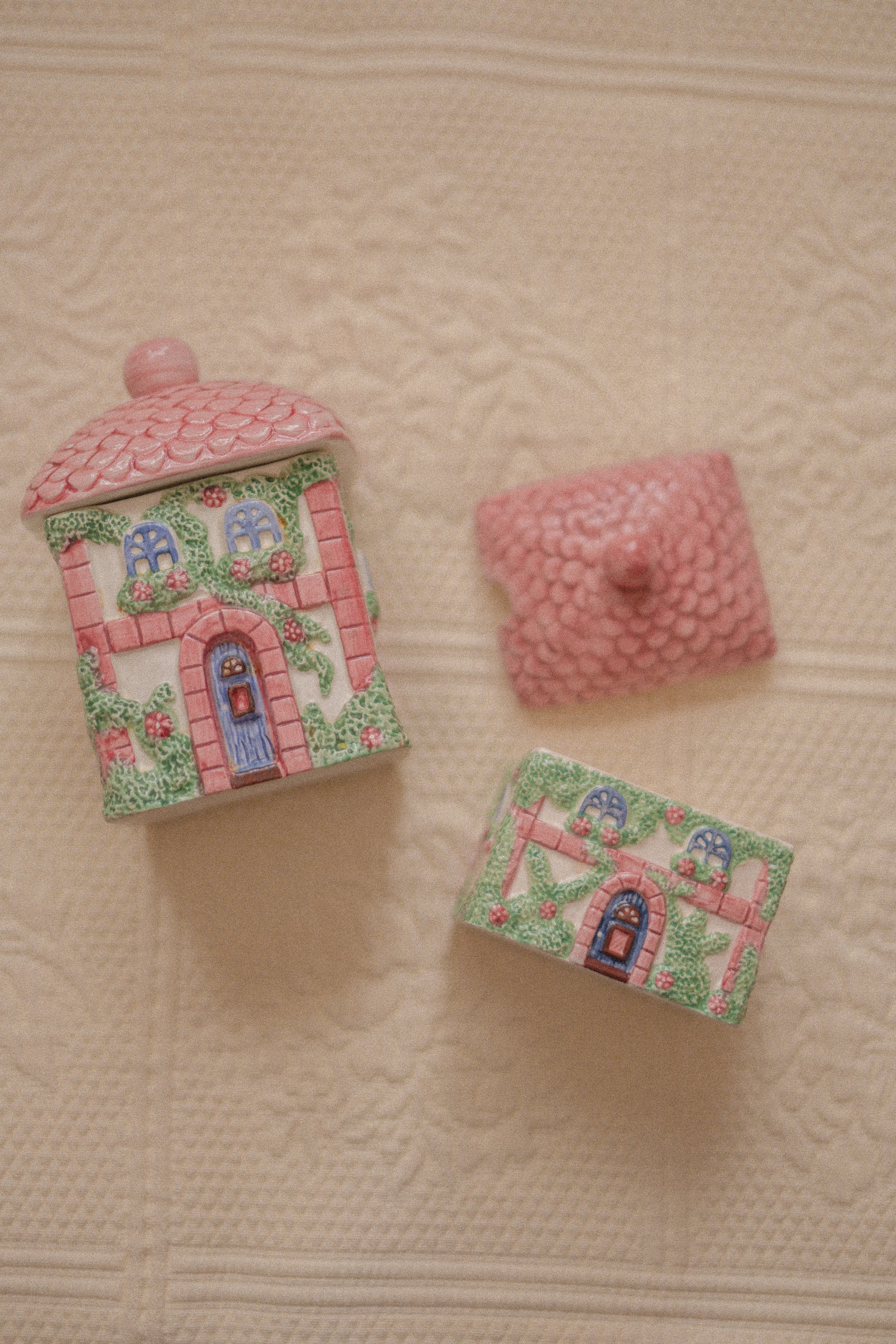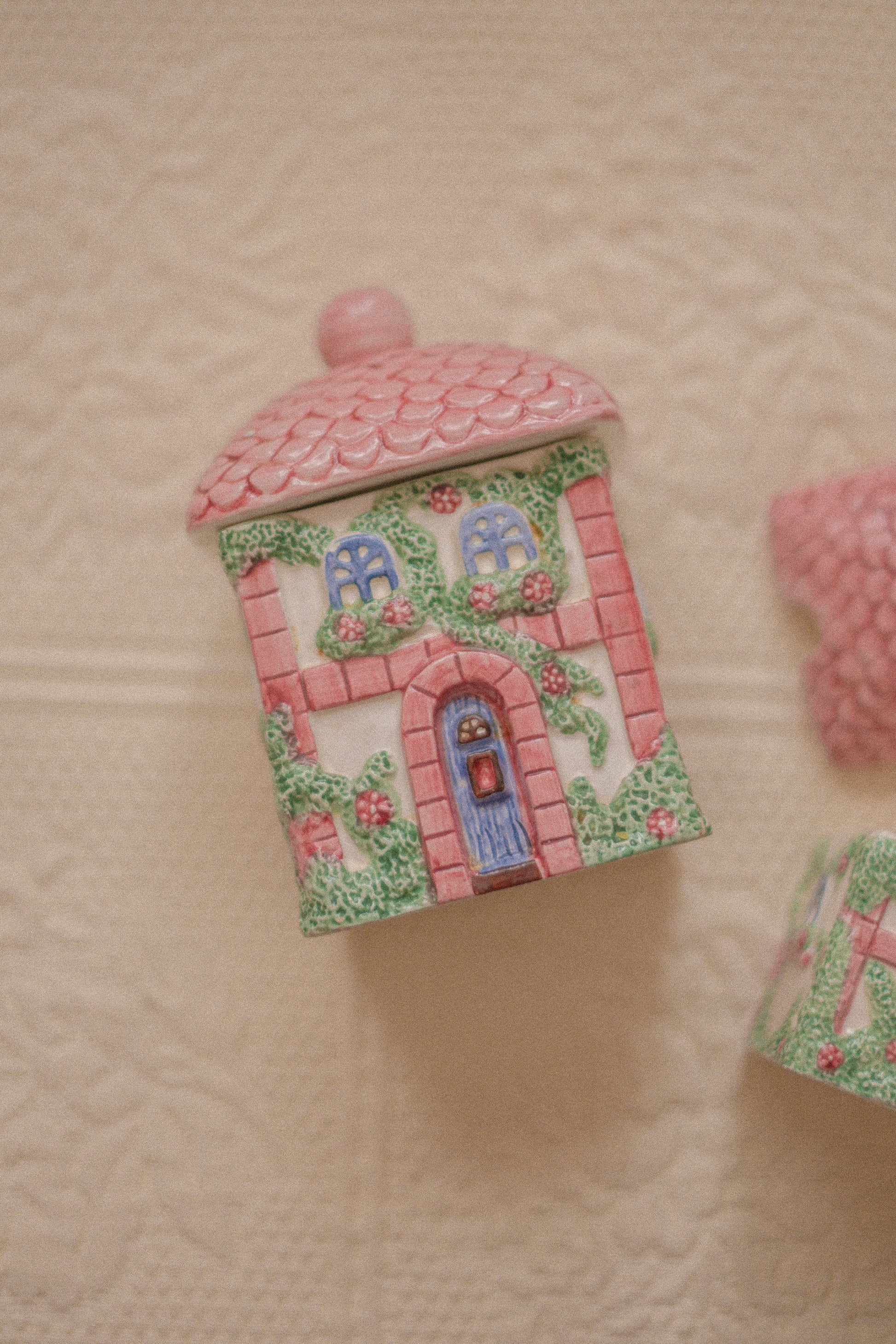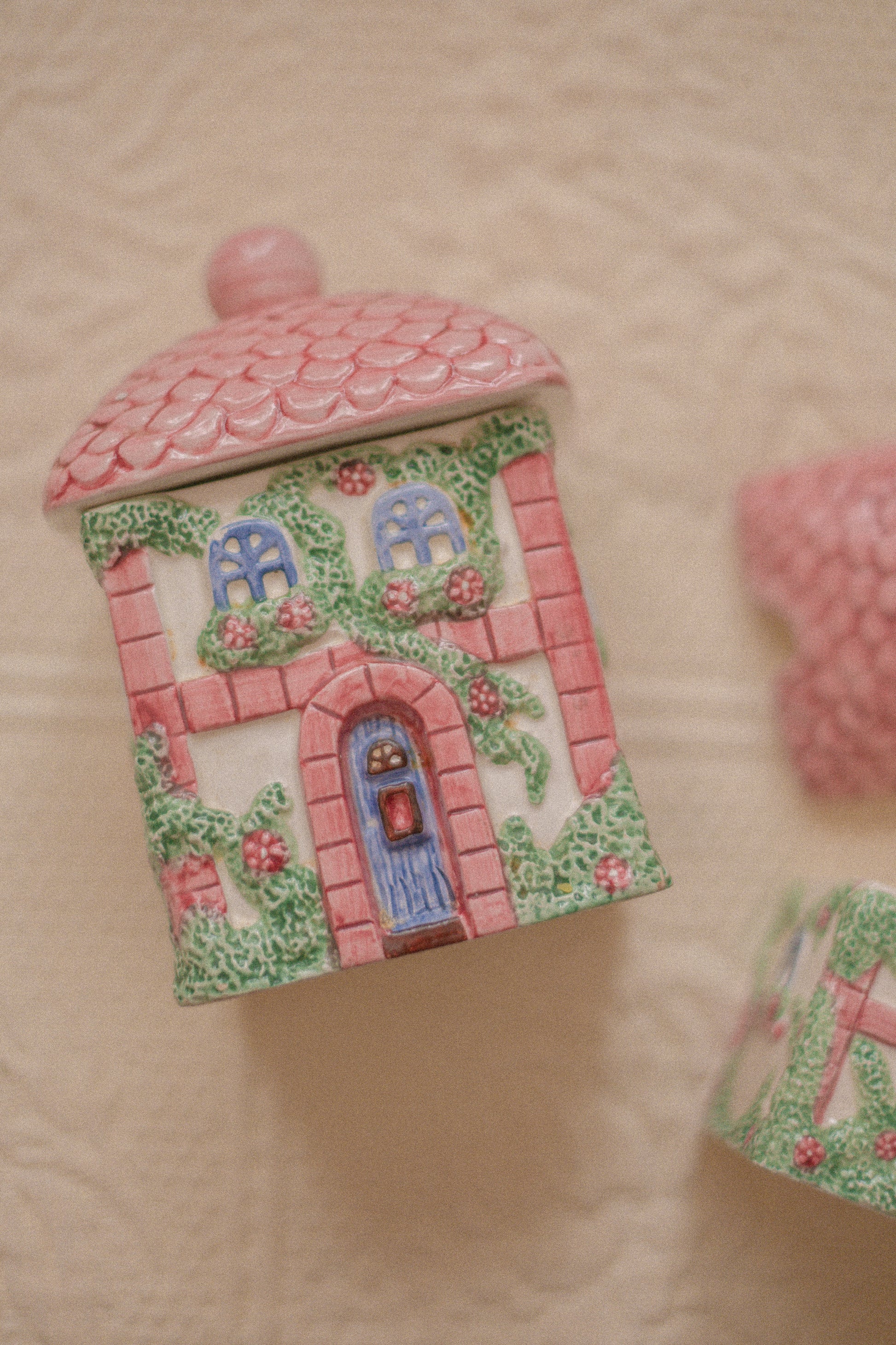 A charming vintage ceramic jar set featuring a sweet little pink cottage shaped sugar jar paired with a coffee or tea jar. This delightful duo feels both whimsical and timeless, bringing a gentle storybook charm to kitchen shelves or open display. Equally decorative and functional, these pieces feel like treasured kitchen keepsakes.