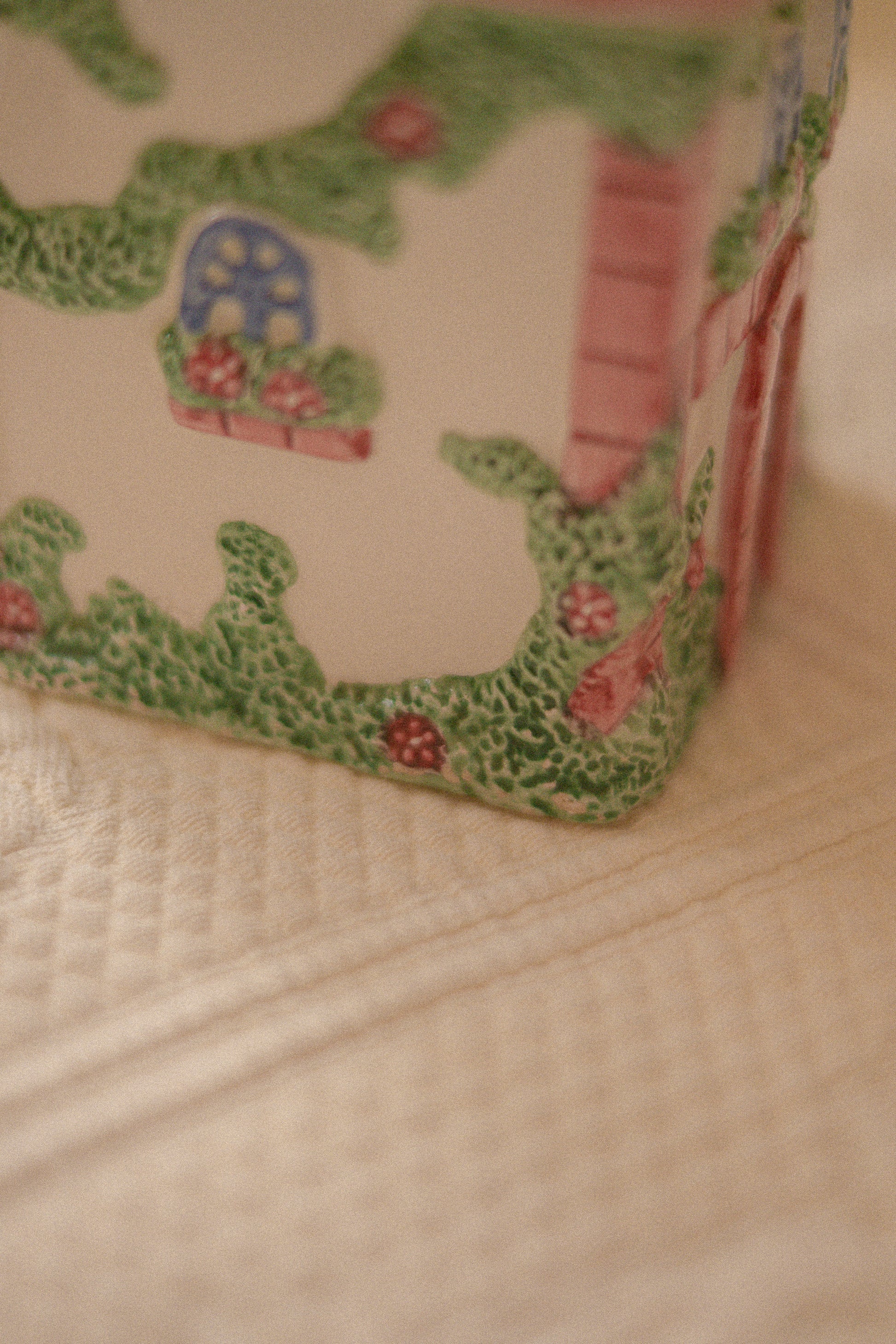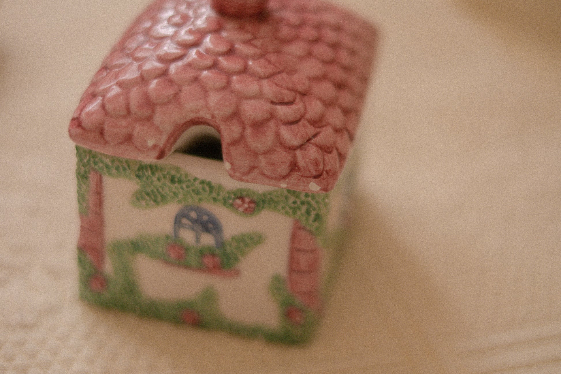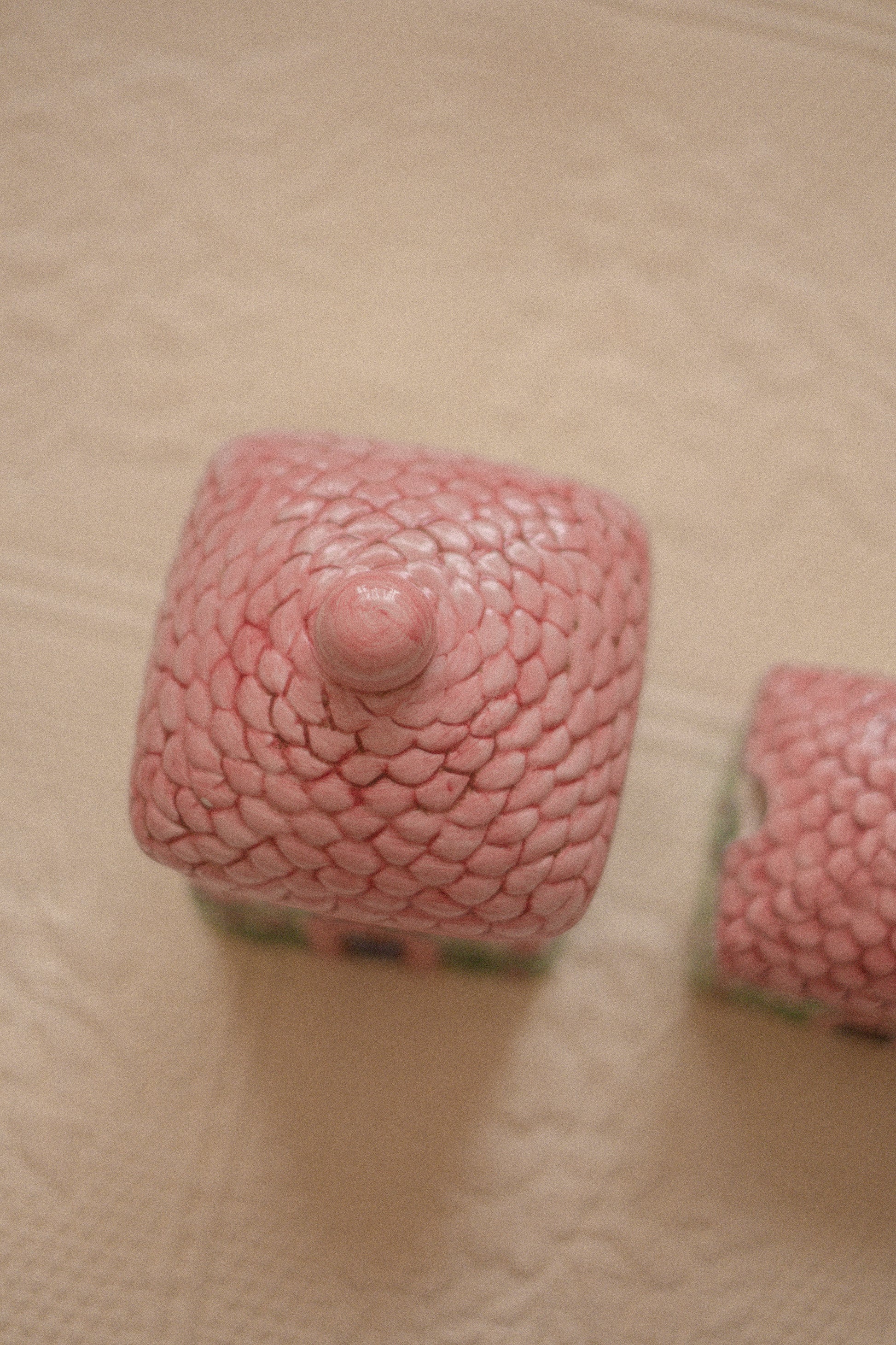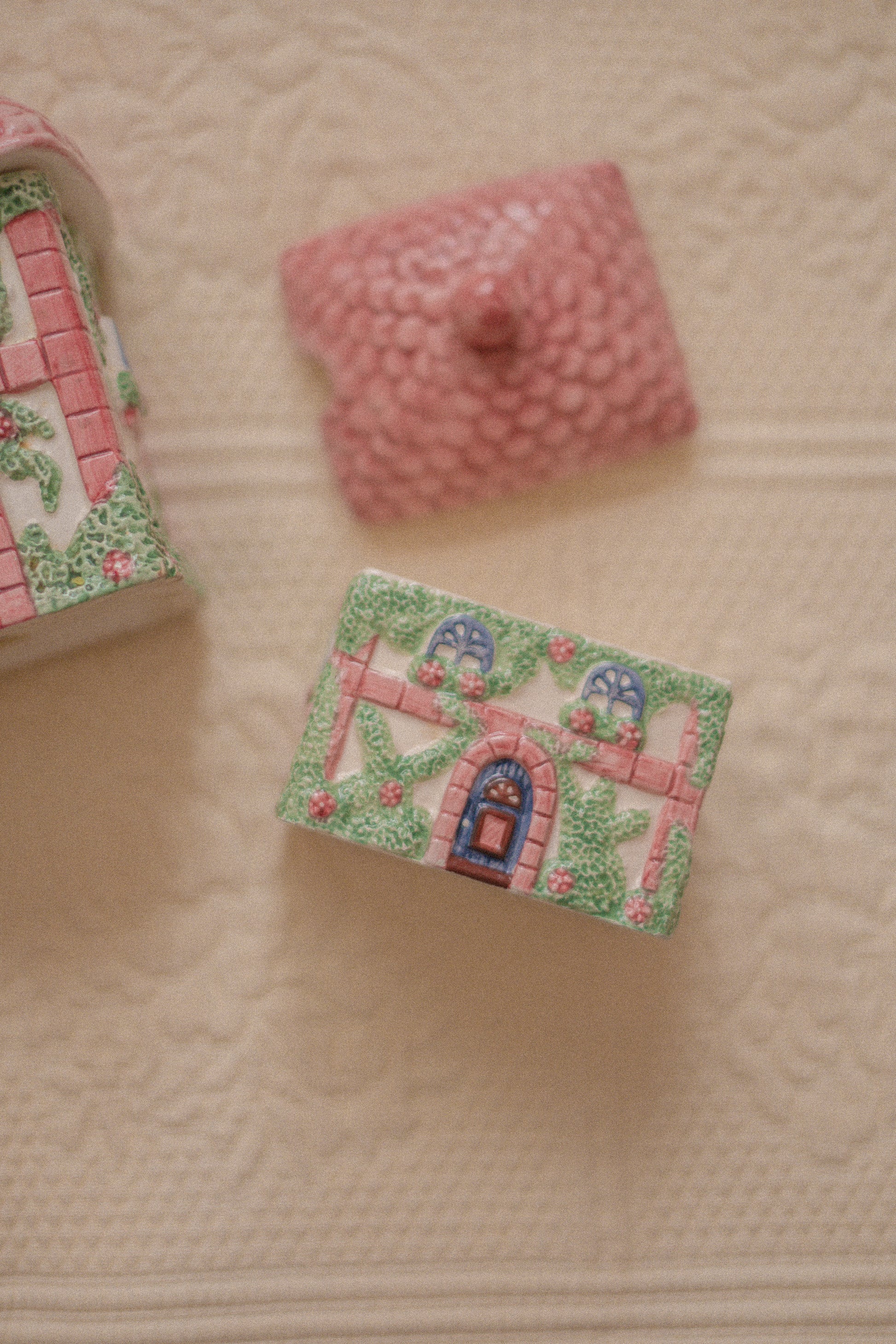 A charming vintage ceramic jar set featuring a sweet little pink cottage shaped sugar jar paired with a coffee or tea jar. This delightful duo feels both whimsical and timeless, bringing a gentle storybook charm to kitchen shelves or open display. Equally decorative and functional, these pieces feel like treasured kitchen keepsakes.
