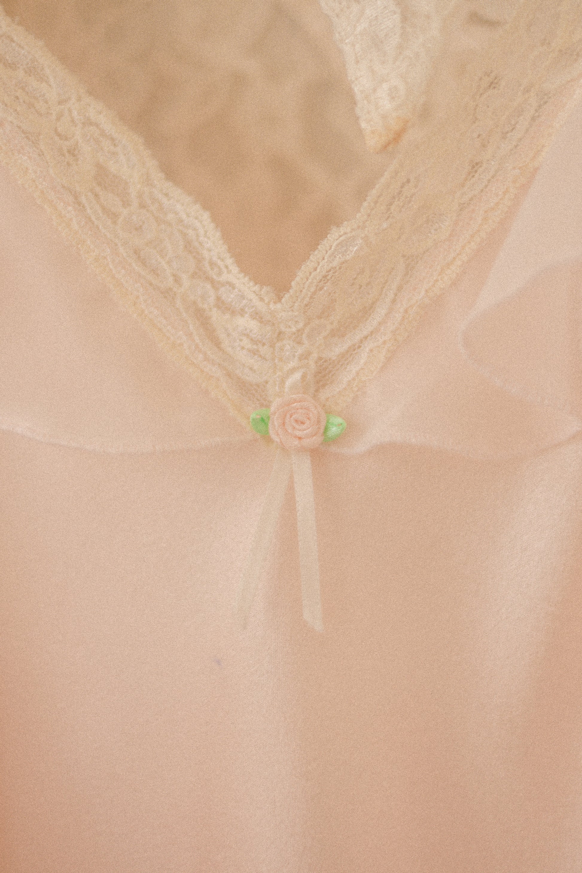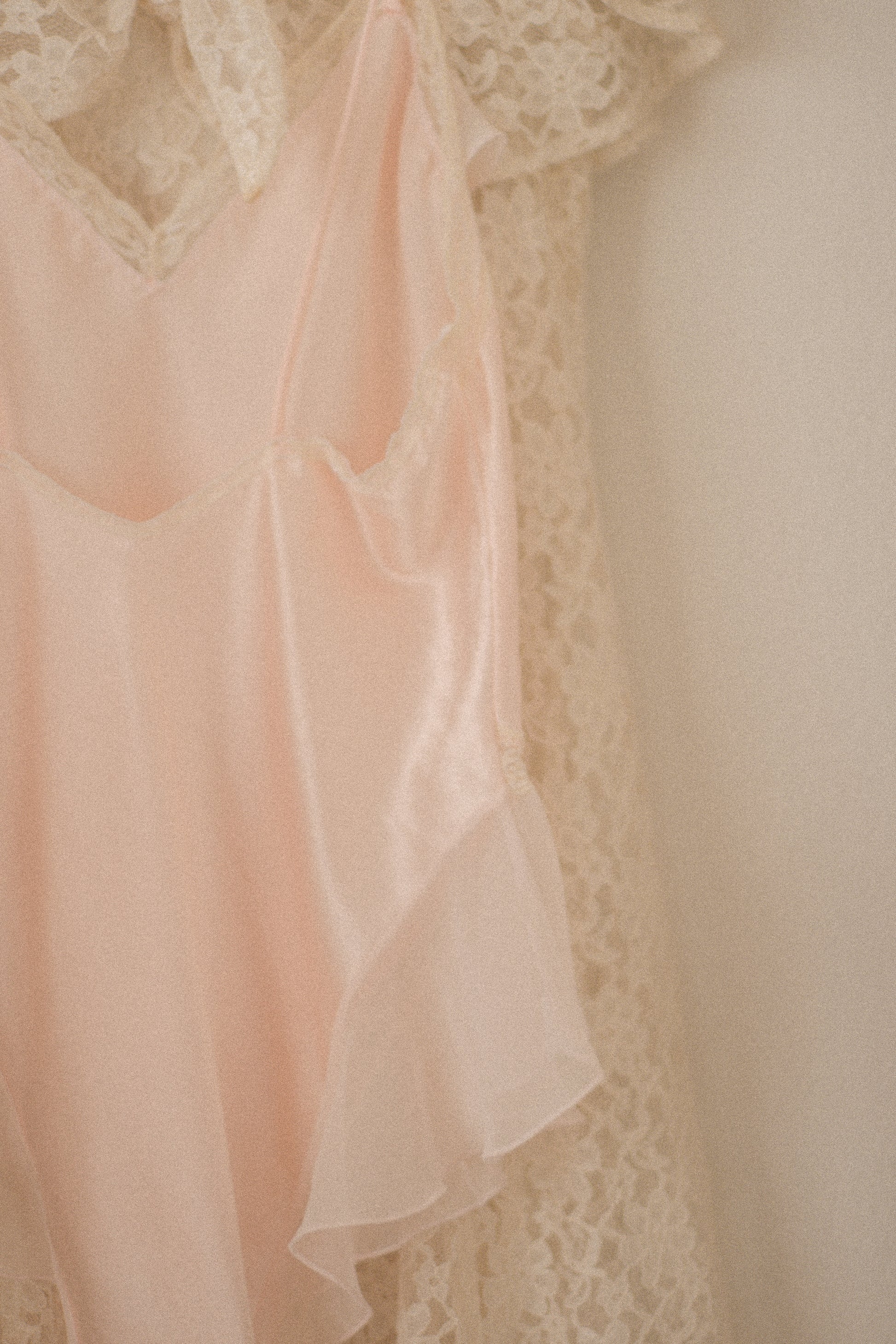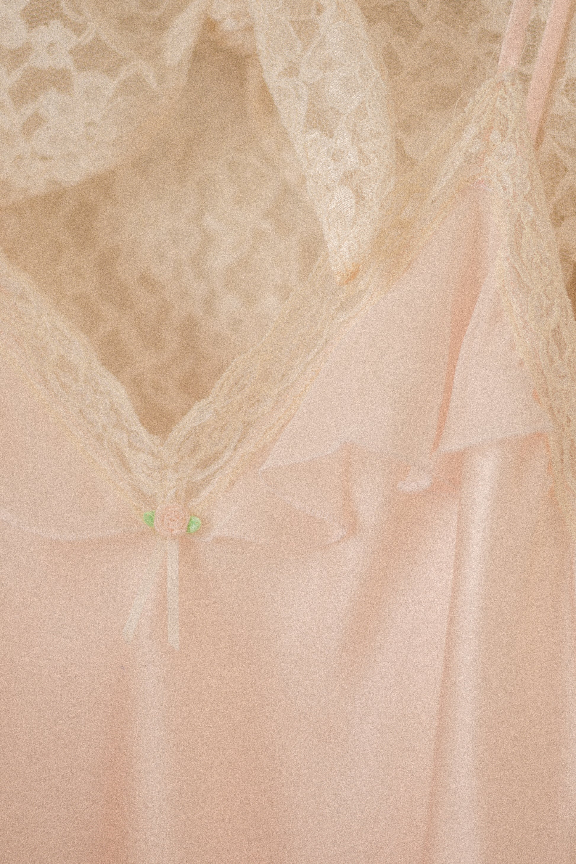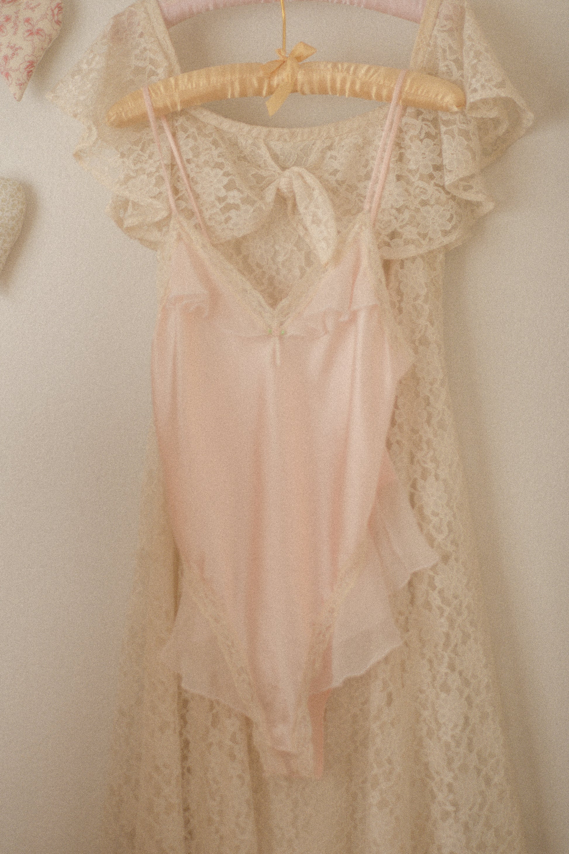 A dreamy vintage pink satin playsuit, delicate feminine charm . Crafted in a soft satin, this piece drapes beautifully against the skin, finished with romantic ruffled trim that adds movement and sweetness. Lace detailing frames the silhouette with an air of old-world elegance, while a dainty rosette accent completes the look with a whisper of nostalgia.