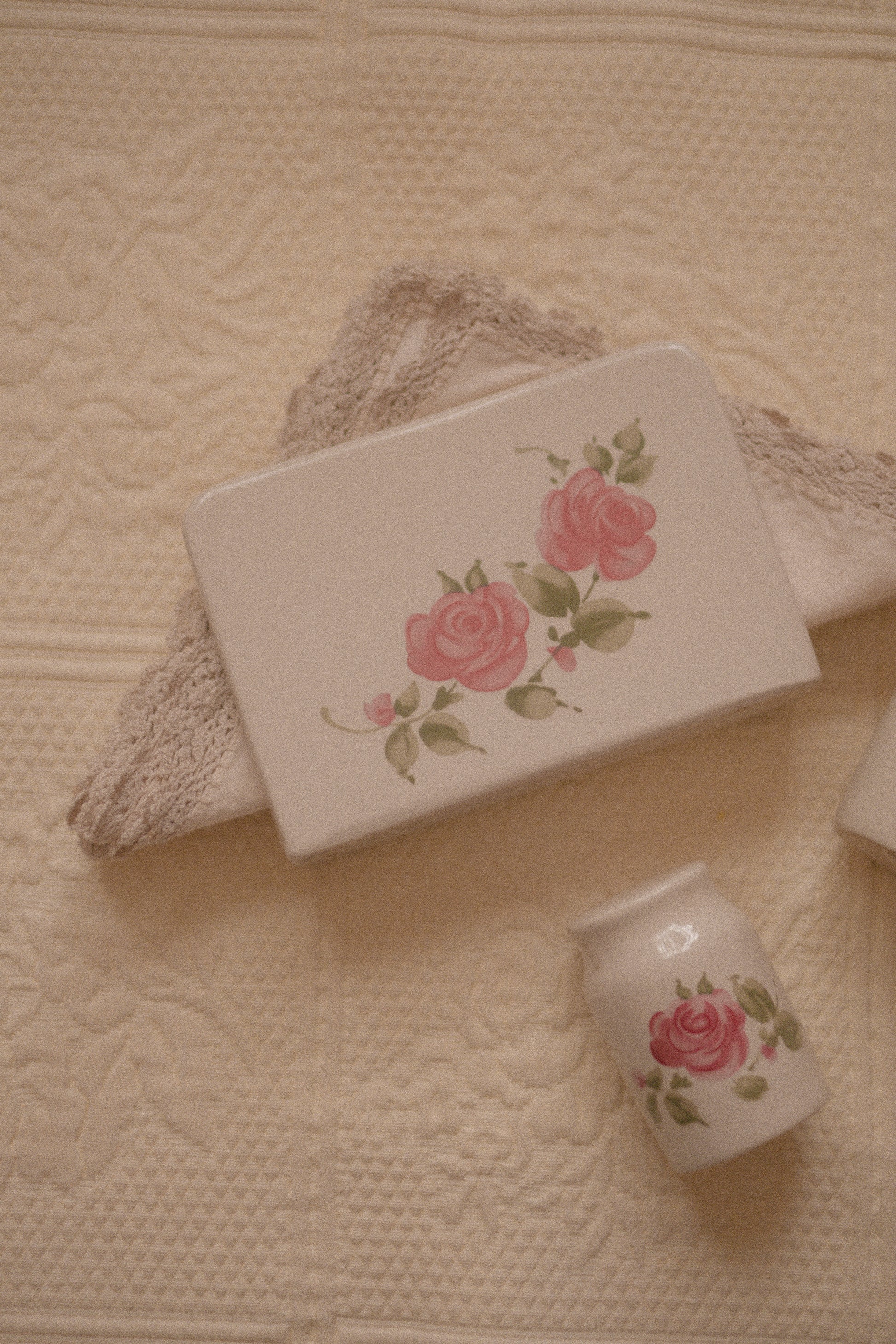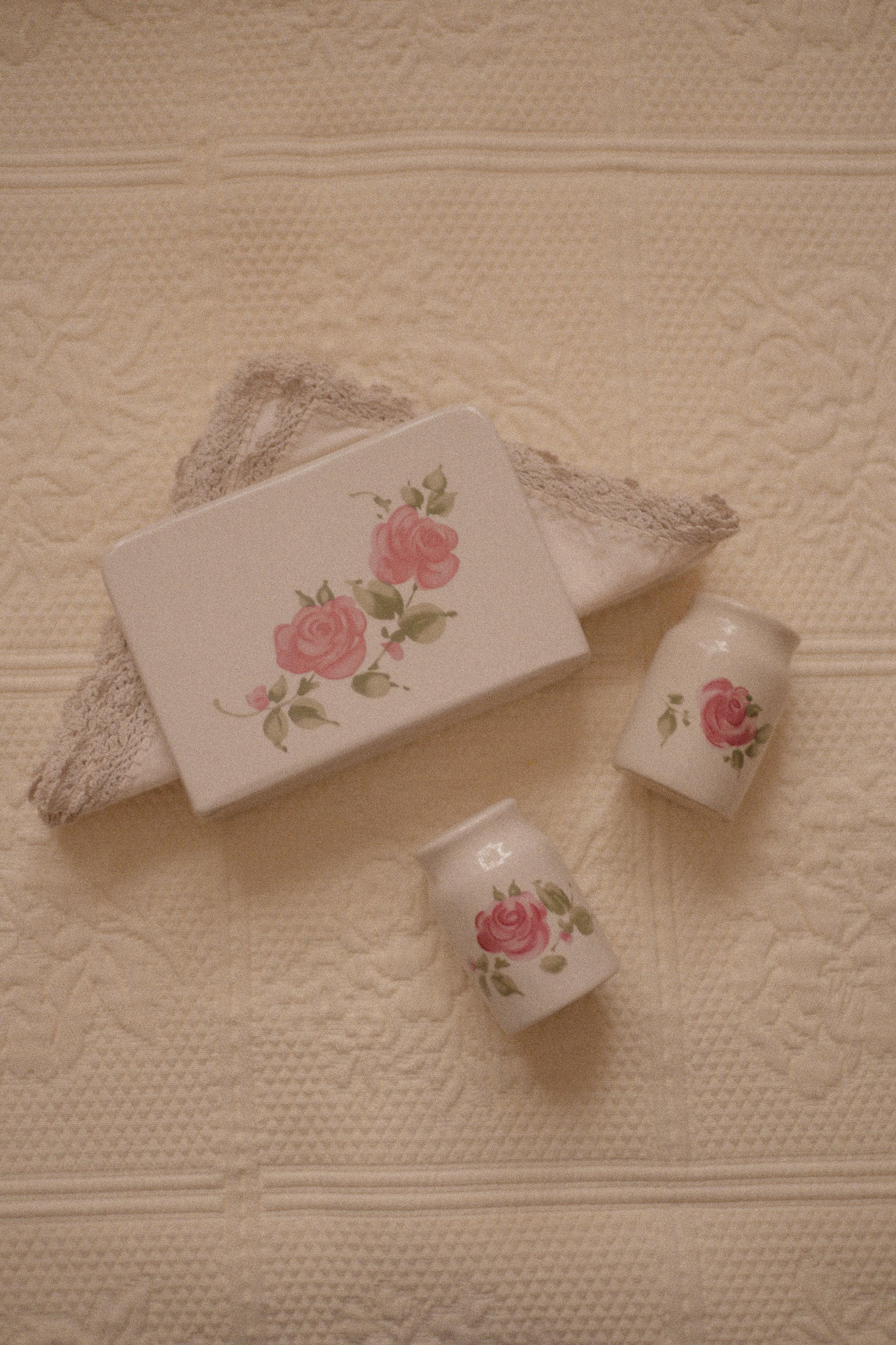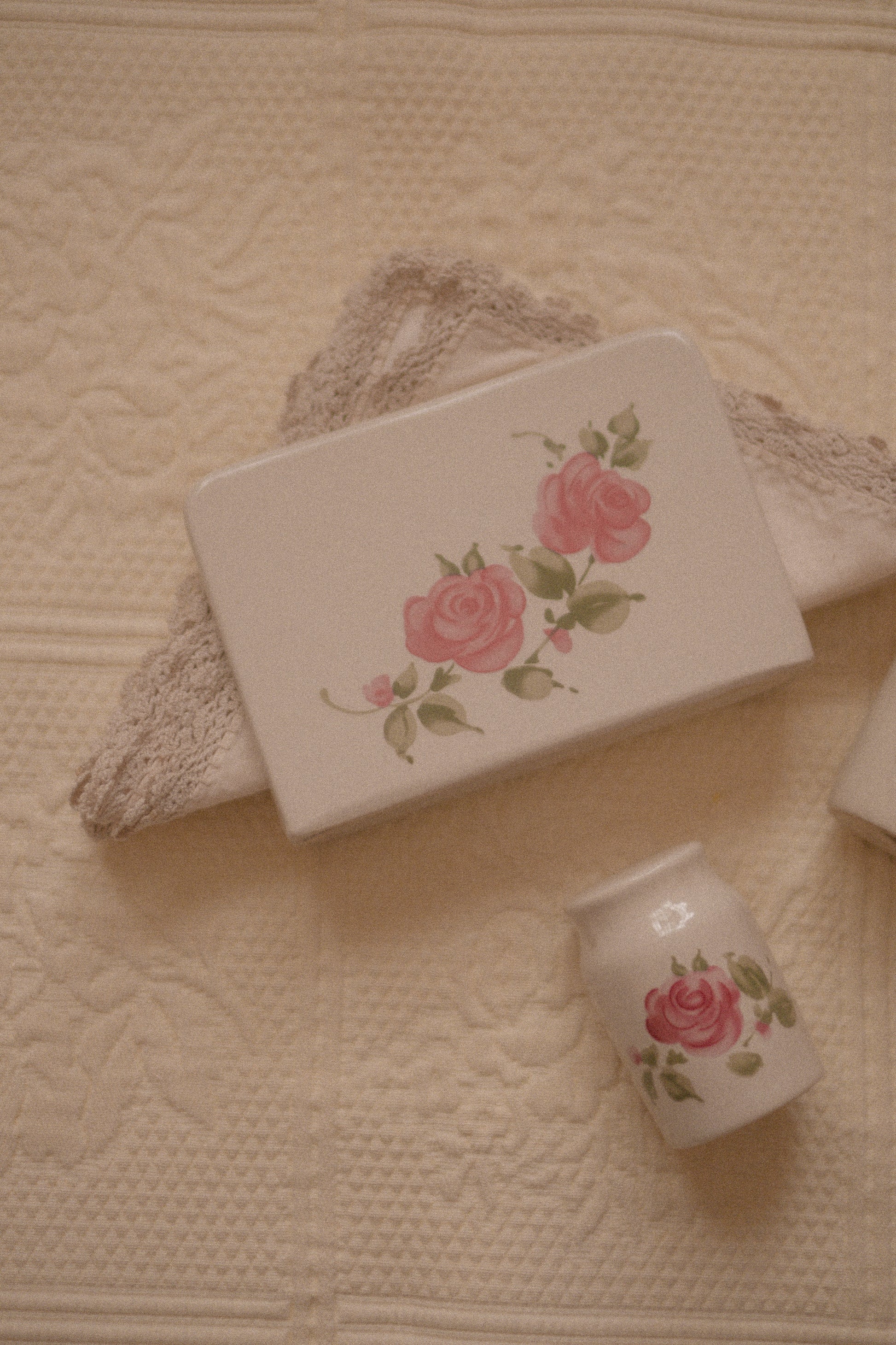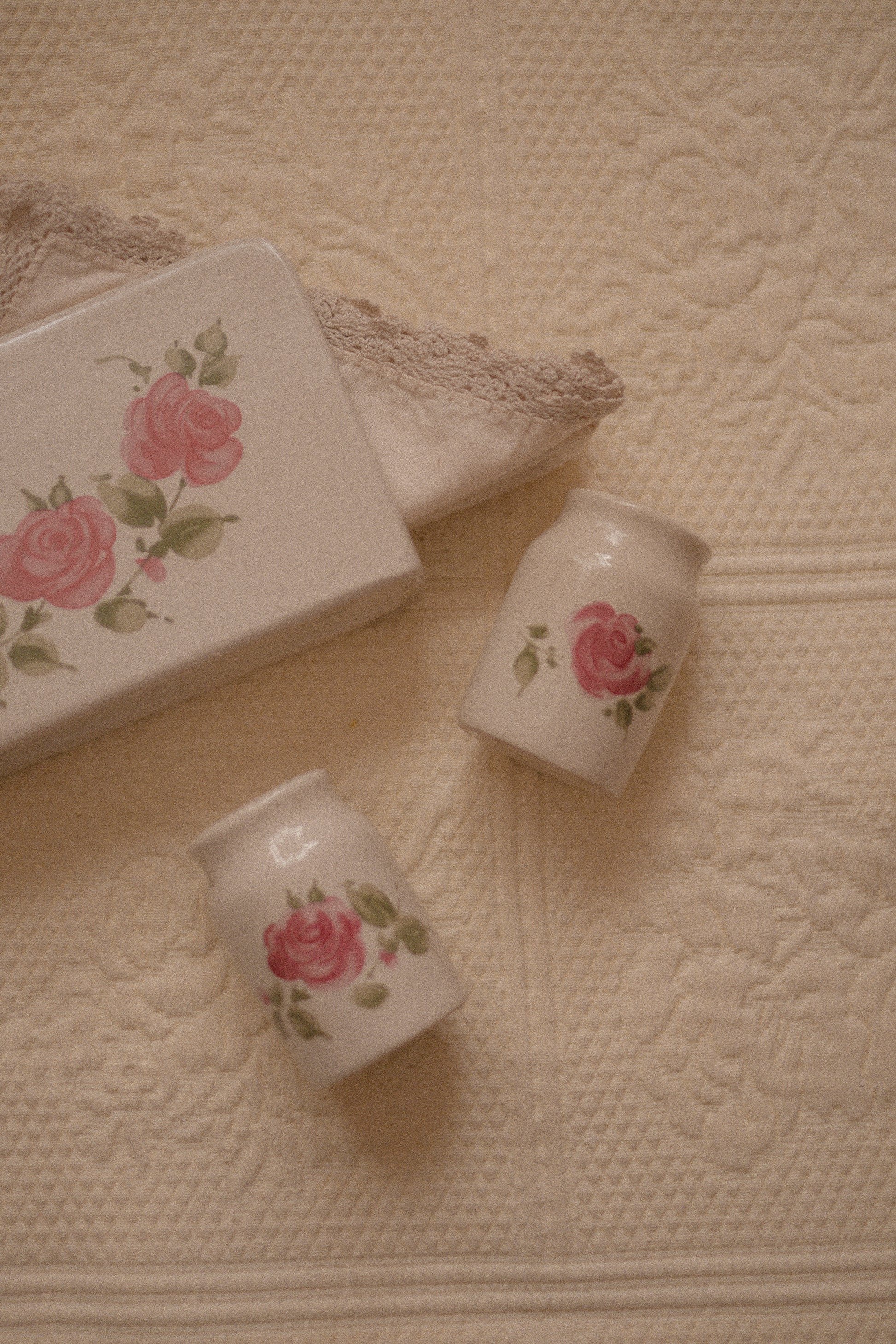 A beautifully delicate vintage ceramic table setting adorned with charming rosette detailing. This coordinated set includes a salt shaker, pepper shaker, and a matching napkin holder. This trio adds a graceful, vintage touch to everyday, feeling like a cherished keepsake meant to be enjoyed and admired.